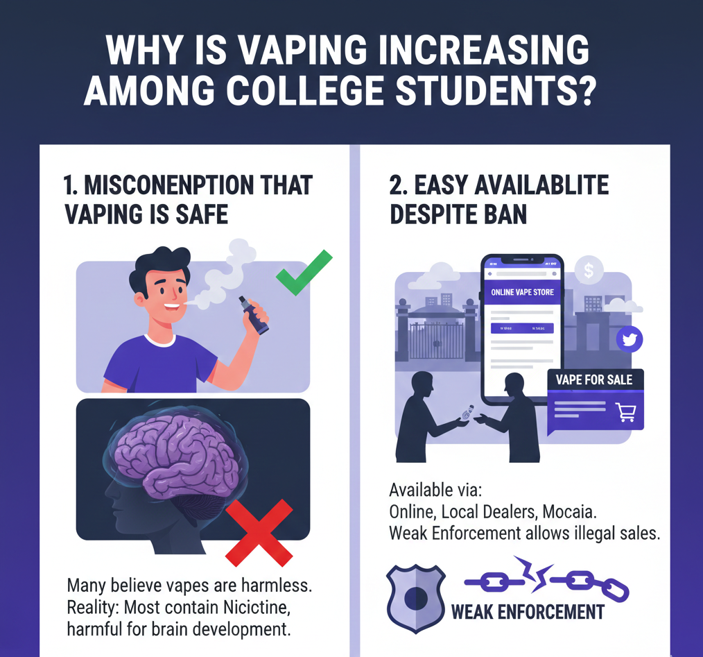 Even after a nationwide ban on e-cigarettes in India, vaping has silently entered college classrooms in Pune. What was once marketed as a safer alternative to smoking has now turned into a growing concern for parents, teachers, and authorities. Easy availability, weak enforcement, and lack of awareness have made vaping common among college students.